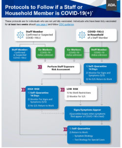 The ADA and CDC have updated their guidance on protocols to follow when dental office staff contract COVID, or are directly exposed through their household or other close contacts. Click this link to download a multi-page document with information on exposures, quarantine recommendations, and steps to follow for vaccinated staff.
