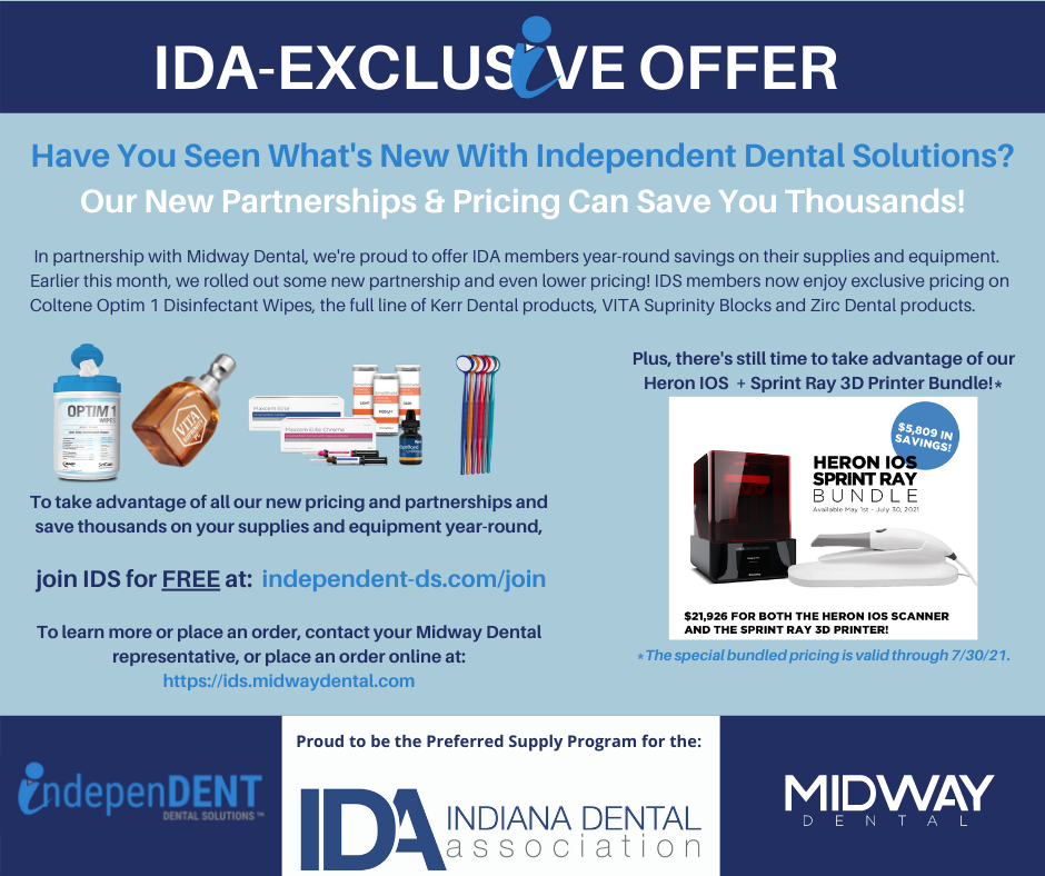 IndepenDENT Dental Solutions (IDS), a group purchasing organization, is the IDA’s preferred vendor and offers lower, contracted pricing for all your practice needs, from dental supplies and capital equipment to lab and other purchased services.